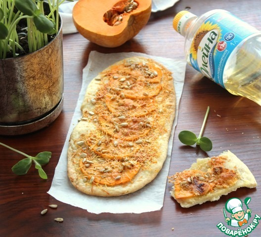 На лепешку выложить нарезанную тыкву, смазать маслом. Посолить, поперчить, посыпать щедро прованскими травами, чтобы вкус тыквы не был пресным. Тыква хорошо сочетается с овощами, поэтому её можно сочетать с любым любимым овощем.
