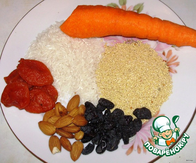 На дно кастрюли уложите слой моркови, на нее слой крупы и миндаль, затем снова слой моркови, залейте горячей водой, медом, так чтобы последний слой овощей был закрыт.