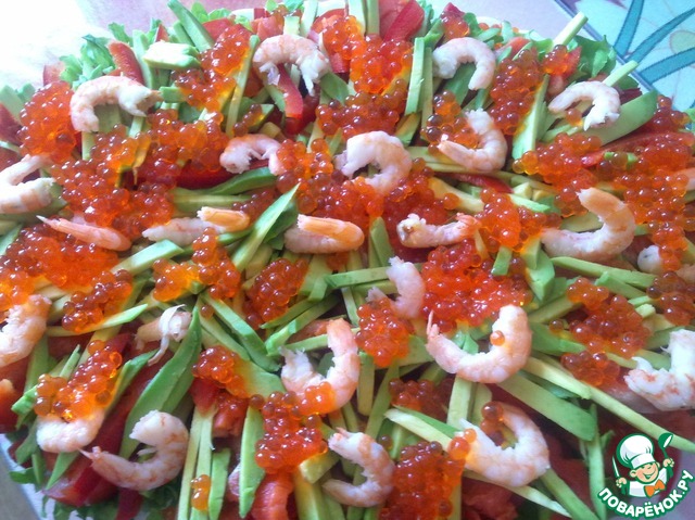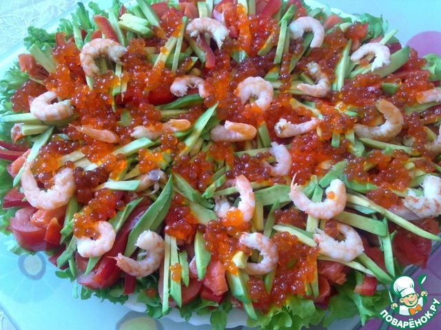 Креветки отварить в кипящей подсоленной воде в течение 3 минут. Готовые креветки очистить от панциря и выложить на авокадо. Затем (по желанию) украсить салат аналогом красной икры.