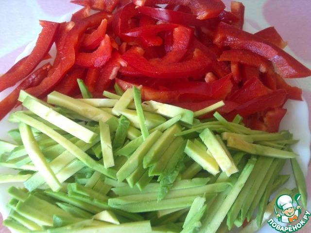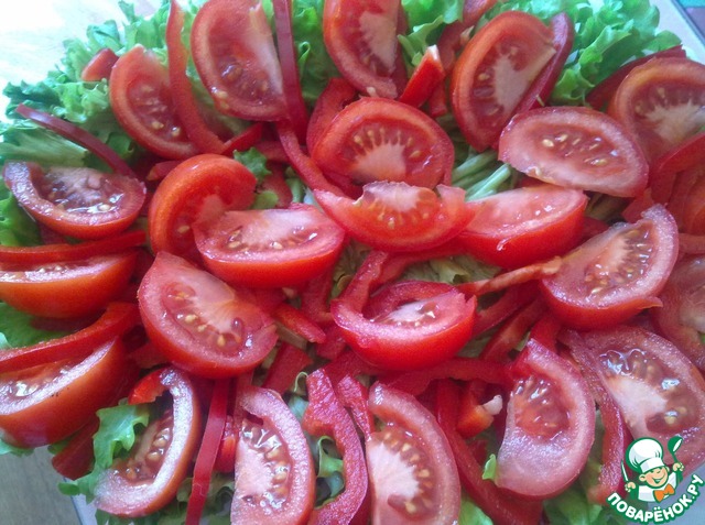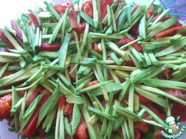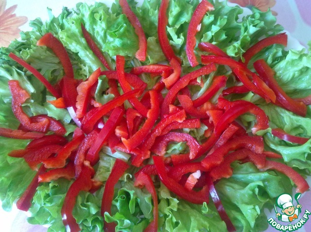 Выложить на блюдо сначала листья салата, а cверху нарезанный болгарский перец.