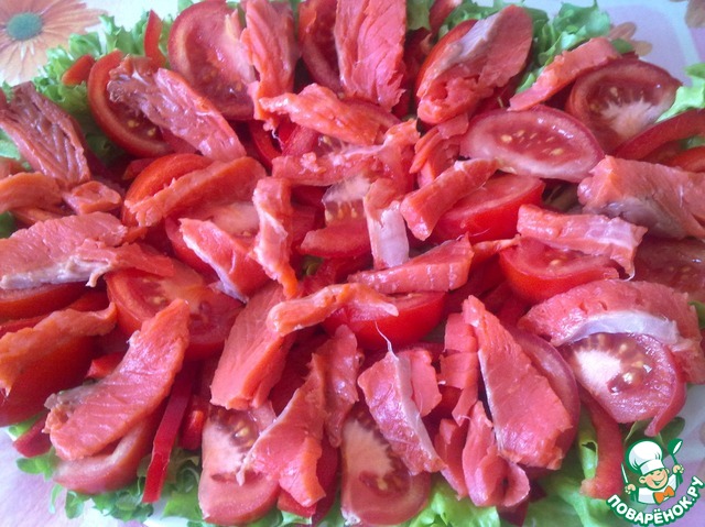 Семгу слабосоленую нарезать на кусочки. Затем разложить ее на помидоры.