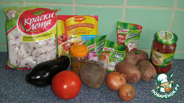 Нарезаем полукольцами репчатый лук, обжариваем его на растительном масле. На крупную терку натираем свеклу, нарезаем кубиками картофель и все это отправляем к луку в сковороду, добавляем немного водички и тушим мин 10. Нарезаем на крупные кусочки баклажан, замачиваем его в соленой воде на 10 мин. , чтобы отдал горечь и кладем в сковороду к нашим овощам. Режем грибочки, у меня были шампиньоны и уже нарезанные, берем красную консервированную фасоль и добавляем их в сковороду + сухой соус "Болонез", он, конечно, предназначен для макарон, но поверьте, с овощами он тоже очень даже сочетается! Вместо соли использую кубики "крошка-паприка", "крошка-лук" и "крошка-укроп", они придают очень приятный аромат + ассорти молотых перцев, томатную пасту - она добавляет кислинки нашим овощам и водички! Все хорошенько перемешать, сверху выложить нарезанный кружочками помидор. Для начала я его обдала кипятком и сняла кожицу.... накрыть крышкой и тушить еще 10 мин. При подаче посыпать зеленью, я добавила еще и соевый майонезный соус. Приятного всем аппетита!