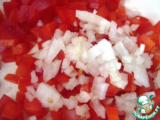 Кускус залить кипятком и оставить под крышкой до готовности. Помидоры, перец и лук нарезать мелко.
