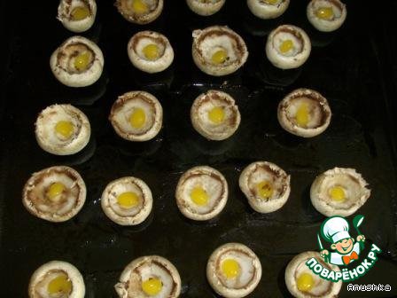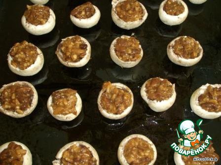Противень смазать маслом, выложить на него шляпки грибов. В каждую шляпку капнуть небольшое количество меда.