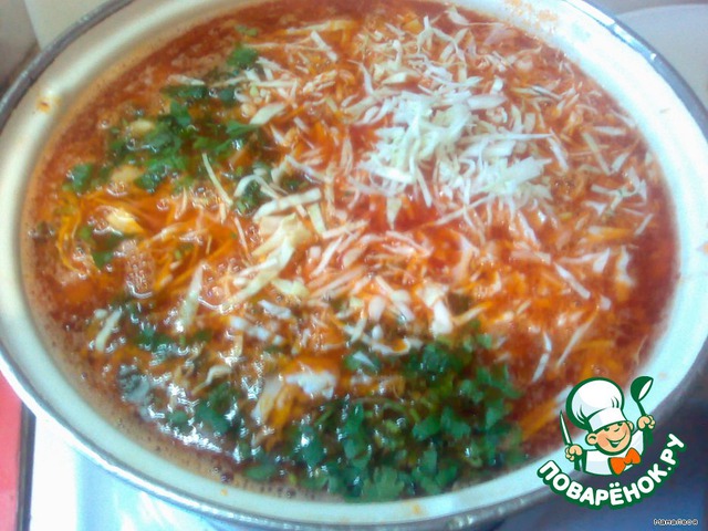 И последнее. Когда сварилась картошка, выкладываем в борщ зажарку, сверху капусту с перцем и зеленью и фасоль. Доводим до кипения, досаливаем, перчим, если надо, доливаем кипяченой горячей воды.