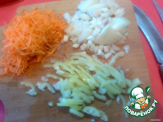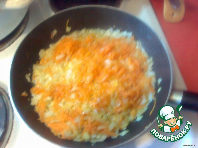 Все ТОЛЬКО на растительном масле! На среднем огне! Слегка поджариваем лук, часто помешивая, добавляем морковь, тоже слегка поджариваем, чтоб только "пустила" цвет.