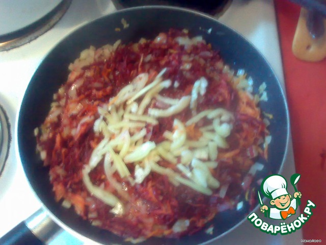 режем кубиками вторую луковицу, трем на терке морковку и буряк, и соломкой половину перца