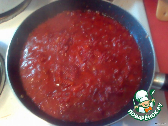 И почти сразу добавляем томат-пасту и полстакана кипяченой воды. Хорошенько перемешиваем, должна быть консистенция густого соуса.