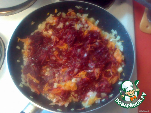 Добавляем бурячок, не забывая помешивать, следить, чтоб не подгорало и сильно не зажарилось, если надо, не стесняйтесь подливать масло. Зажарка не должна быть сухой.