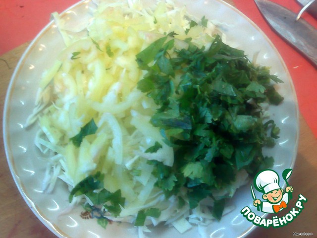 Нарезаем соломкой вторую половинку переца и зелень, сколько душа просит.