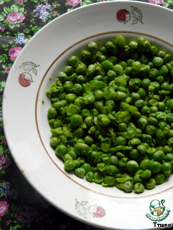 Зеленый горошек бланшировать в кипящей воде. Откинуть на дуршлаг и немного размять с помощью вилки.