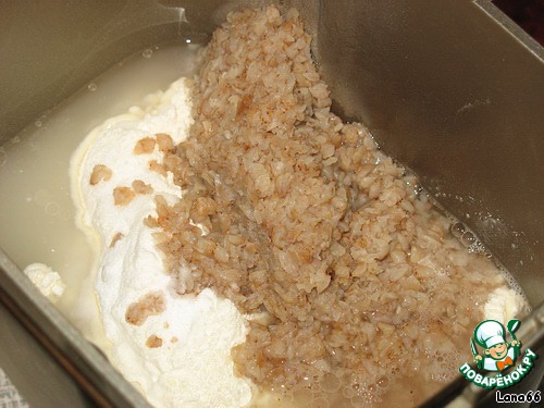 Я замешивала тесто в хлебопечке, в режиме "пицца". Поэтому продукты закладывала как по инструкции. Для ручного замеса нужно перемешать сухие дрожжи с сахаром, солью и мукой (свежие дрожжи развести водой и дать вспениться). Добавить набухшие хлопья. Вымесить, добавляя растительное масло.