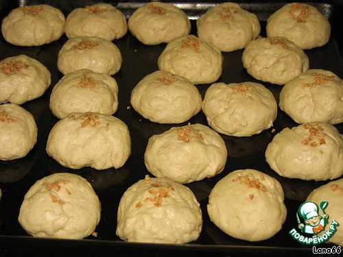 Сформировать из теста небольшие шарики и выложить на масляный противень. Дать подойти и выпекать 15-20 минут при 180*С