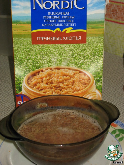 В гречневые хлопья добавить стакан горячего кипятка и дать хлопьям набухнуть минут 5.