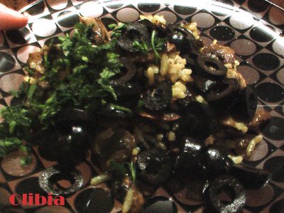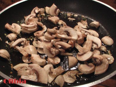 В начинку с грибами добавляем маслины резаные колечками, рубленую зелень и резаную мякоть баклажана. Солим по вкусу, добавляем орегано.