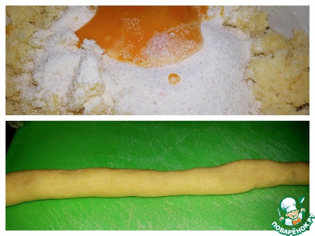 3. Раскатываем в тонкий жгут, нарезаем на небольшие кусочки, выкладываем на доску, посыпанную мукой.
