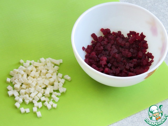 Свёклу варим до готовности, охлаждаем, чистим и вместе с тофу нарезаем мелким кубиком.