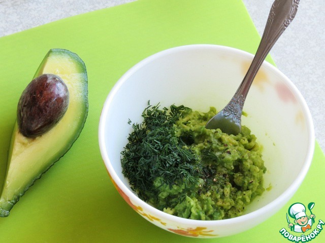 Авокадо разрезаем, удаляем косточку. Отделяем мякоть, разминаем её вилкой не очень мелко. Добавляем мелко рубленный укроп, соль, перец, сок лимона, оливковое масло и хорошенько перемешиваем!