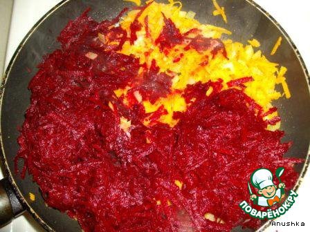 Лук мелко режем, обжариваем на растительном масле. Добавляем потертую на крупной терке морковь и снова обжариваем. Далее идет тертая на крупной терке свекла. Добавляем ее в сковородку и обжариваем все вместе. Разводим в половине стакана воды кетчуп, соль и перец и выливаем в сковороду. Тушим, помешивая, под закрытой крышкой.