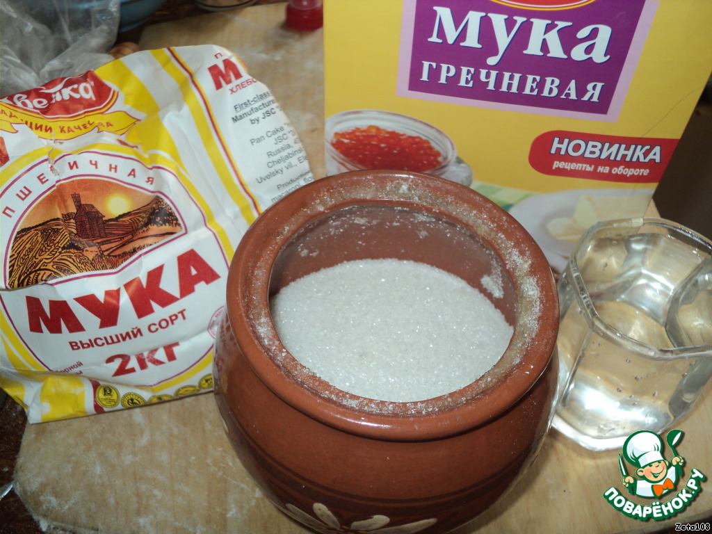 Смешать два вида муки, добавить сахар и воду, вымесить тесто.