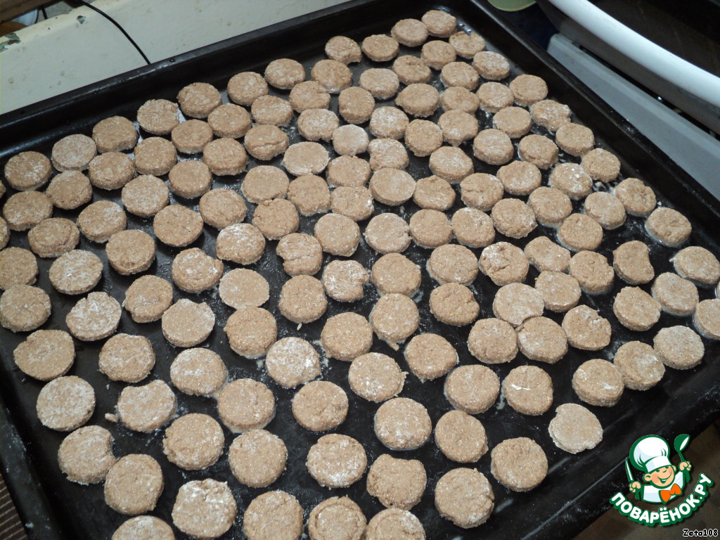Выложить на противень получившиеся кругляшки, а так как сейчас пост и масло никакое нельзя, то просто противень смочить водой, чтобы печенье не пригорело.