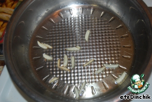 На подогретом в сковороде подсолнечном масле слегка поджариваем тонко нарезанный чеснок.
