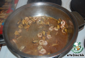 Высыпаем и слегка поджариваем мидии и креветки. Буквально 1-3 минутки.