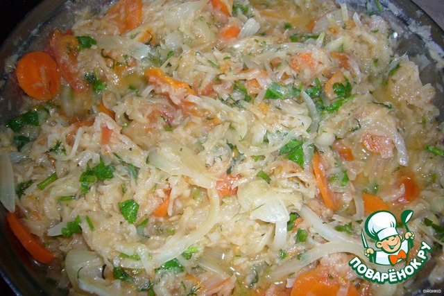 Я положила и петрушку, и укроп, и кинзу. А из специй только соль. Сельдерей и зелень (особенно кинза) сами очень ароматны. В оригинальном рецепте была ещe кольраби (она тушится вместе с луком и морковью), но в магазине еe не было.