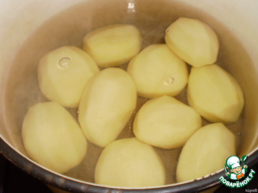 Очистить картофель, чтобы чистого веса было 1 килограмм. Налить в кастрюлю воды и вскипятить. В кипящую воду опустить картофель и варить до готовности. Посолить по вкусу.