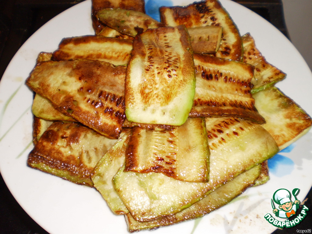 Кабачки помыть поскрести, разрезать на две части. Затем нарезать их на тонкие пластины по 1 см шириной, посолить.