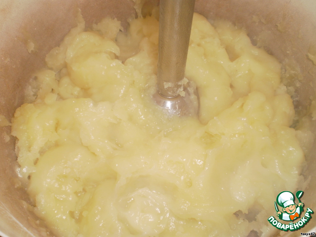 Слить воду с вареного картофеля, немного остудить, добавить готовый лук и потолочь (блендером или протереть через сито).