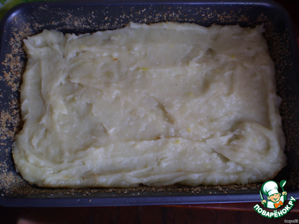 Противень смазать маслом, посыпать сухарями и уложить половину картофеля.