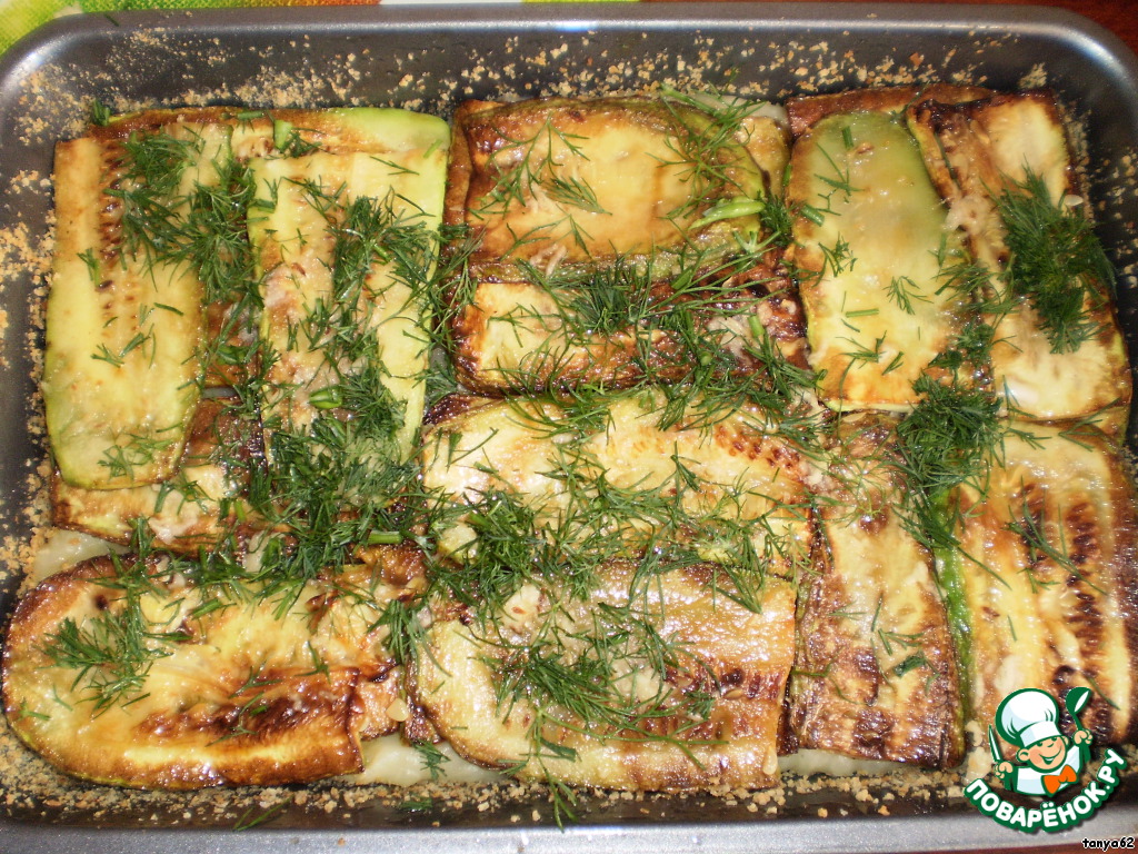 Сверху картофеля уложим кабачки, присолим, поперчим, посыпем тертым на мелкой терке чесноком, а затем положим нарезанный укроп.
