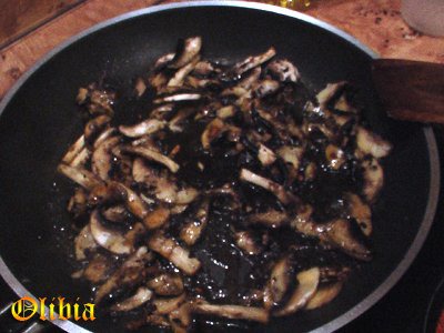 Теперь измельченные свежие грибы (можно разных, у меня были шампиньоны), сок лимона, щепотку коричневого сахара (можно и обычный если уж нет) и 2 ст. ложки соевого соуса. Все вместе обжариваем на небольшом огне под крышкой около 3-5 минут.