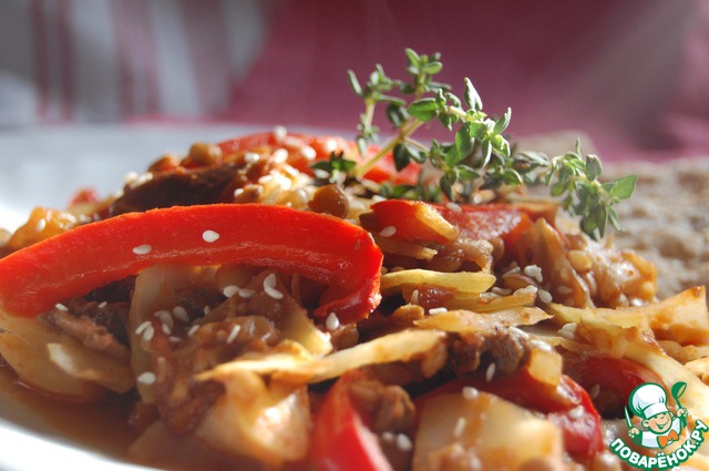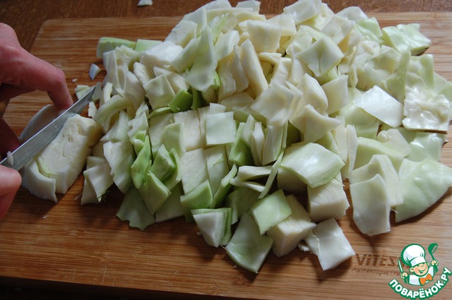 У капусты удалить кочерыжку. Нарезать квадратами со стороной примерно 2 см. Сладкий перец очистить и нарезать тонкими ломтиками. Лук нарезать кольцами.