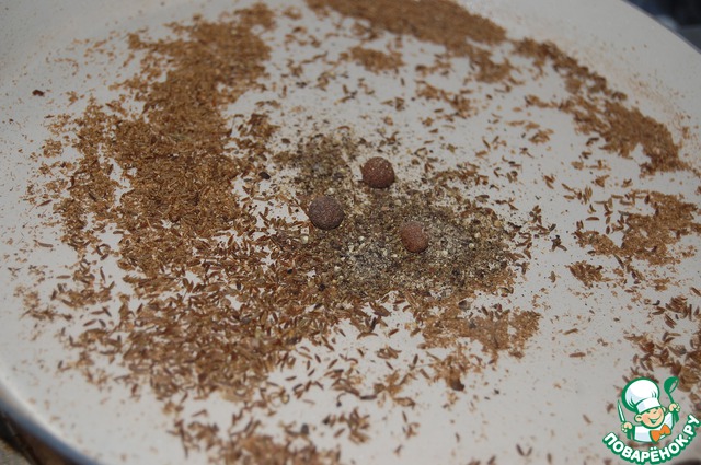 Зиру, кориандр, чёрный и душистый перец прогрейте на сухой сковороде.