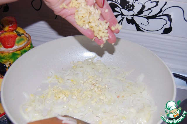 Долейте в сковороду 2 ст. л масла, положите лук, чеснок, и имбирь, обжаривайте 2 мин.