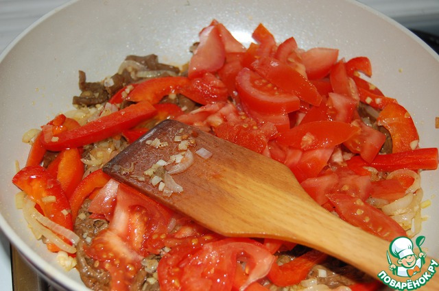 Добавьте перец, отваренные грибы, немного потушите. Затем положите помидоры и ещё немного потушите.