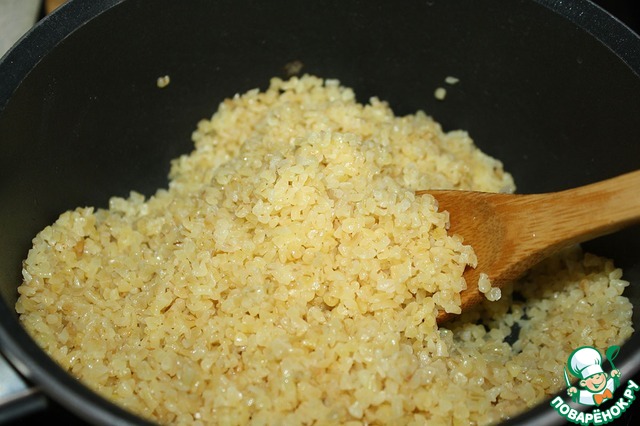Обжариваем булгур на оливковом масле, добавляем соль, после появления орехового запаха, добавляем воду и варим на медленном огне 15 мин. Перемешиваем, добавляем сок лимона и даем булгуру остыть