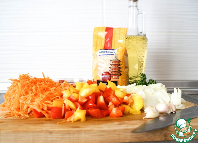 Морковь натереть на терке, перец нарезать средними кубиками, лук - перьями. Очистить чеснок.
