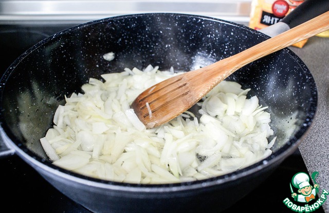 В казане/глубокой сковороде с толстым дном спассеровать лук в хорошо разогретом растительном масле.