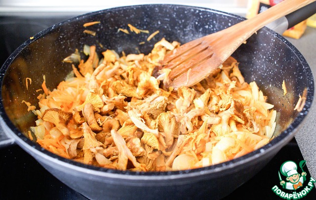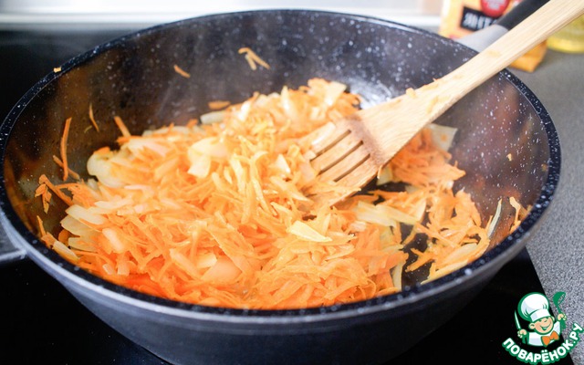 Добавить морковь, обжарить, помешивая, пока морковь не отдаст цвет и смесь не станет ярко оранжевой.