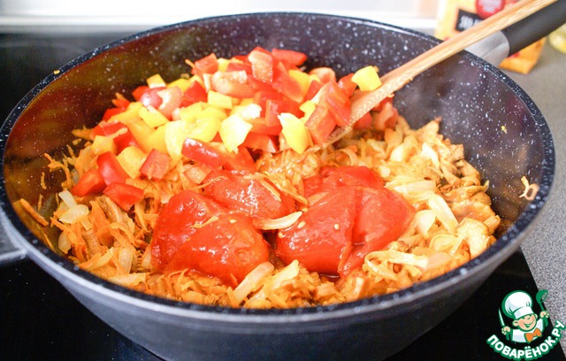 Добавить слегка помятые вилкой томаты с соком, сладкий перец, барбарис, соль и перец по вкусу, хорошо перемешать, потушить все вместе около 10 минут.
