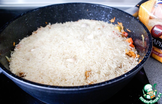 Залить все водой приблизительно на 2 см выше слоя риса, довести до кипения, уменьшить огонь, накрыть крышкой и готовить около 40 минут, пока рис не впитает всю воду и не станет мягким. С того момента, как рис добавлен к зажарке, и до самой его готовности - перемешивать ничего не нужно, так рис получается рассыпчатым. По готовности выключить огонь и оставить плов на плите под закрытой крышкой "дойти".