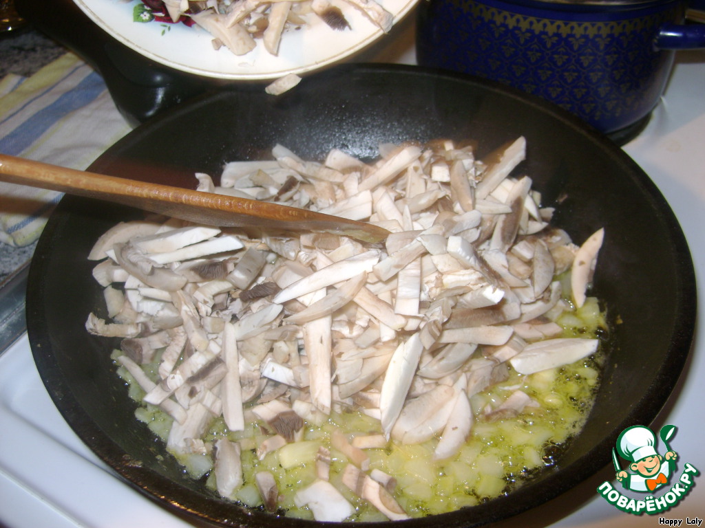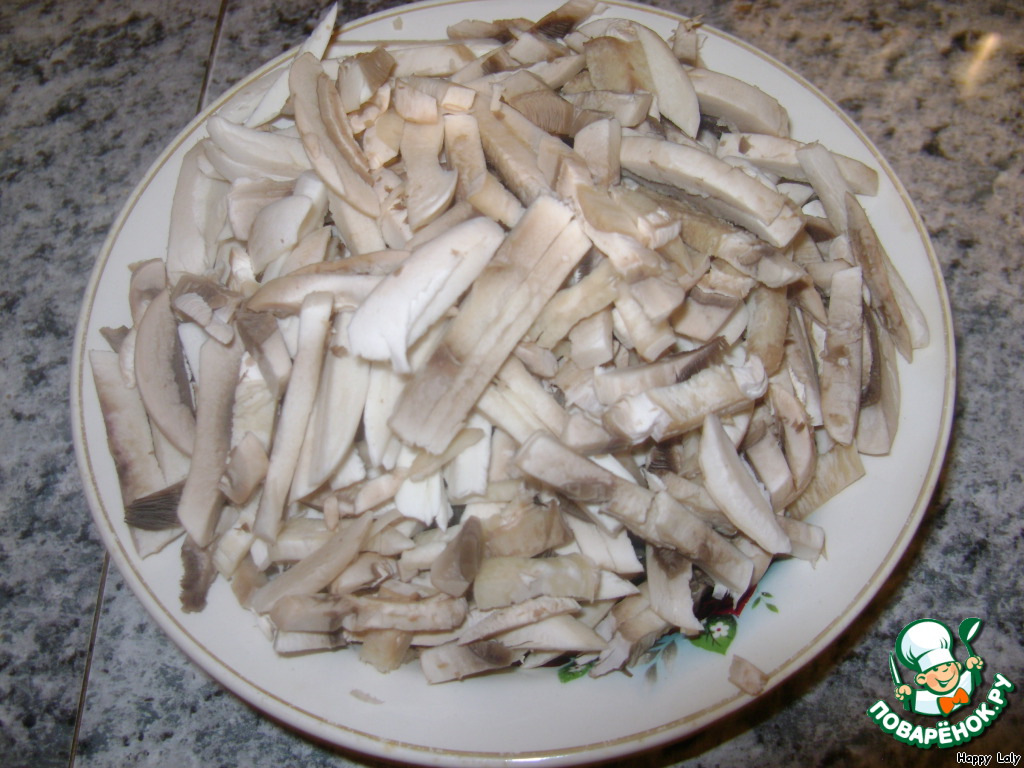 Подготавливаем все продукты. В первую очередь режем шампиньоны соломкой.