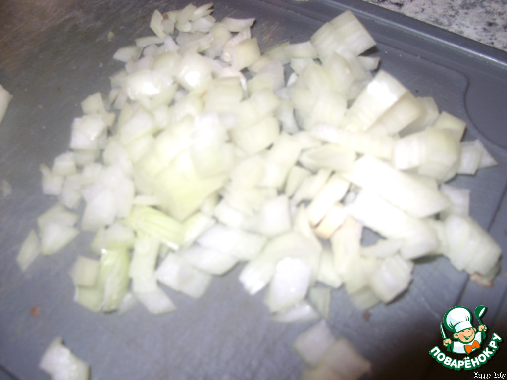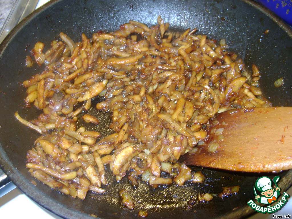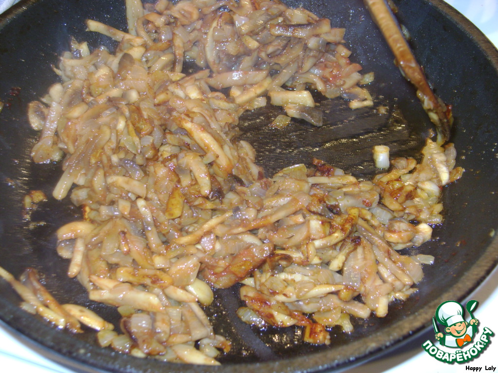 Жарим лук до золотистого оттенка (НО не корочки), как на фотографии.
