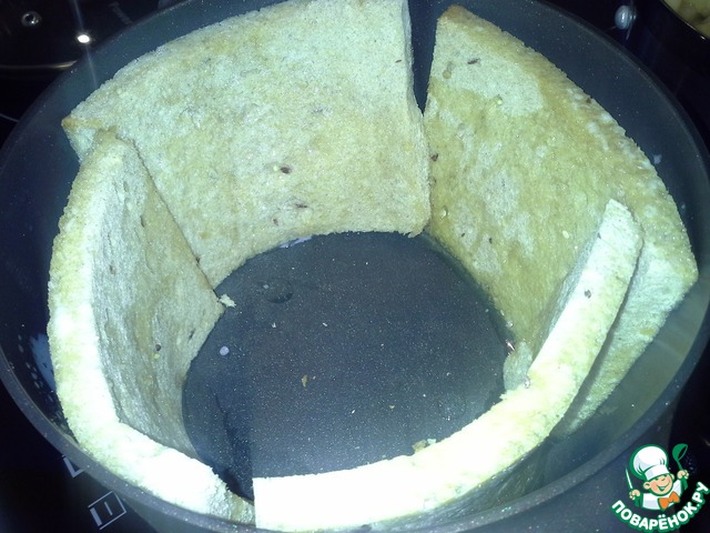 Обмакиваем каждый кусочек хлеба с обеих сторон в маргарин и выкладываем стенки и дно кастрюли. Ломтики хлеба кладем внахлест. Кастрюля должна быть толстостенная.