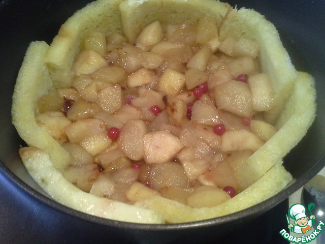 В яблоки добавляем корицу и смородину. Выкладываем начинку в кастрюлю. Начинки должно быть много, она должна плотно прижимать хлеб.