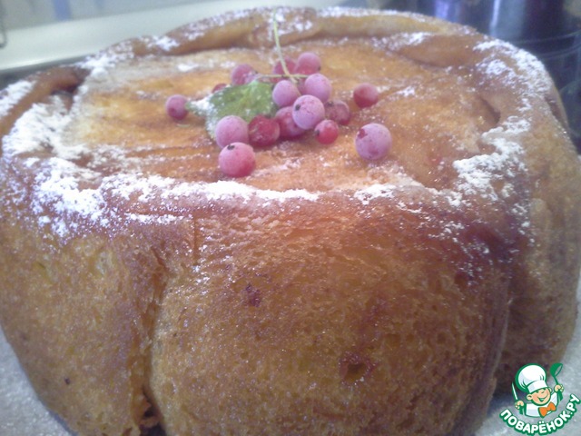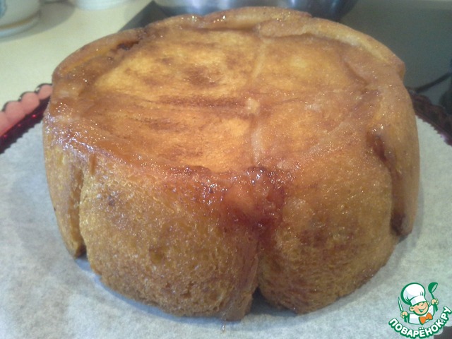 Вынимаем пирог, аккуратно перевернув кастрюлю на поднос. Кусочки хлеба, пропитанные маслом и яблочным соком должны спечься друг с другом.