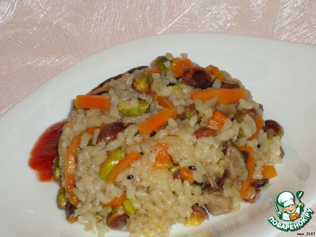 Промыть рис, добавить в овощи, залить кипятком и добавить фисташки, шафран, кунжут, перец и соль по вкусу.